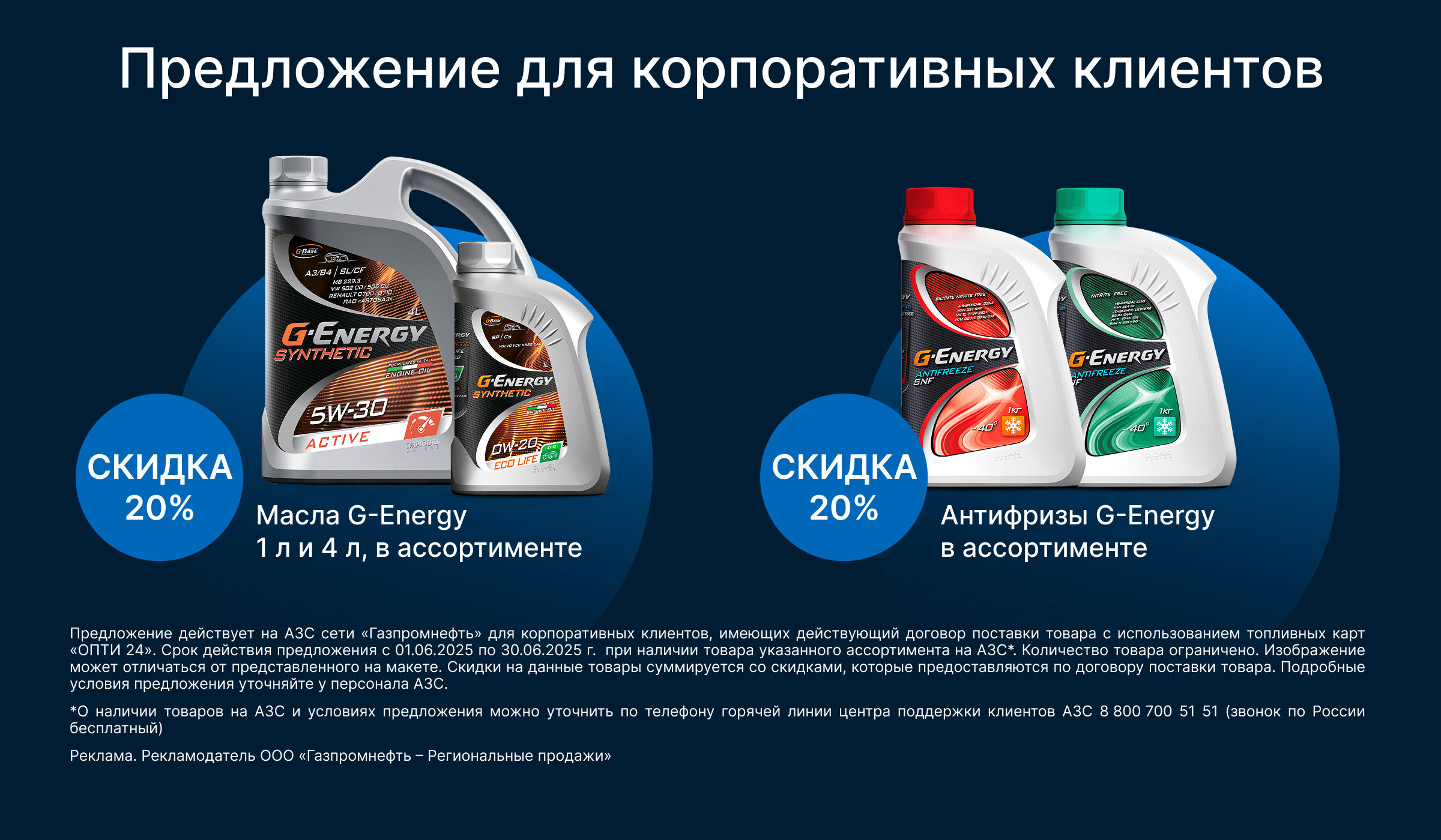 Предложение действует для новых корпоративных клиентов, заключивших договор с ООО «Газпромнефть-Региональные продажи» (ОГРН 1084703003384) в период с 01.06.2025 г. по 31.07.2025 г. Скидка действует в течение 3 месяцев с даты заключения договора, но не позднее 30.09.2025 г.Ï